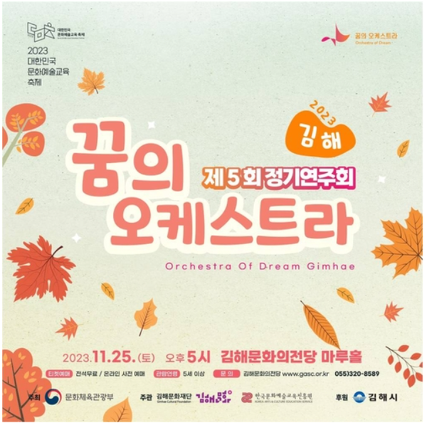 김해 어린이와 청소년들이 참여하는 '꿈의 오케스트라 김해'의 제5회 정기연주회가 11월 25일(토) 오후 5시에 김해문화의전당 마루홀에서 열린다. '꿈의 오케스트라 김해'는 문화체육관광부와 한국문화예술교육진흥원이 주관하는 문화예술교육사업으로, 한국형 '엘 시스테마' 교육철학을 기반으로 지역 초등학생과 중등학생에게 음악합주 무상교육을 제공하여 상호배려, 이해, 협동심을 기르는 예술교육 프로그램을 운영하고 있다.