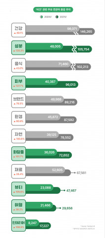 이에 비해 2021년에는 뷰티, 패션, 인테리어 등 다양한 산업군에 비건이 적용되면서 △성분(+120.3%) △피부(+137.1%) △화장품(+101.7%) △뷰티(105.6%) △인테리어(+108.9%) 등 연관어가 높은 증가율을 보였다.
