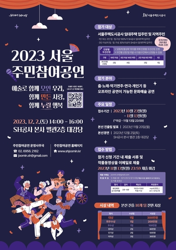 서울주택도시공사(SH공사)는 '2023년 주민참여공연'을 개최하고 11월 13일까지 작품을 접수받는다고 밝혔다. 이 행사는 코로나19 엔데믹 이후 돌아온 일상의 기쁨을 함께 나눌 수 있는 공공주택 입주민과 지역주민의 화합을 위해 마련된 행사로, 올해로 9회째를 맞이하게 된다. 지난 8년간 공연 참가자와 지역주민, 공사 임직원들이 함께 즐기는 축제의 장으로 자리매김해 왔다.