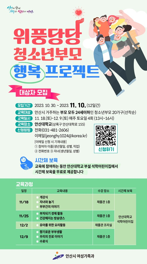 안산시는 청소년부모들의 행복을 위한 '위풍당당 청소년부모 행복 프로젝트'를 18일부터 12월 9일까지 운영할 예정이라고 밝혔다.