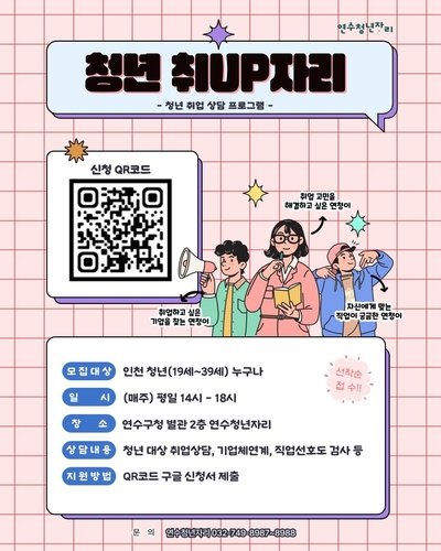 연수구는 청년 취업을 위해 매주 평일 14시부터 18시까지 연수청년자리(연수구 청년센터)에서 '청년 취UP(업)자리'라는 취업상담창구를 운영할 예정이다.