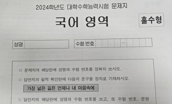 2024학년도 수능에서는 양광모 시인의 시 '가장 넓은 길'의 구절인 '가장 넓은 길은 언제나 내 마음속에'가 필적 확인 문구로 선택되었다. 이 문구는 수험생들에게 희망과 동기부여를 전달하며, 어떠한 어려움을 겪더라도 내 안에 가장 넓은 길이 있다는 의미를 담고 있다.